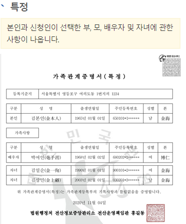 ▶ 특정은 본인과 신청인이 선택한 부, 모, 배우자, 자녀에 관해서 기재됩니다. 즉 표기대상자를 선택할 수 있습니다.