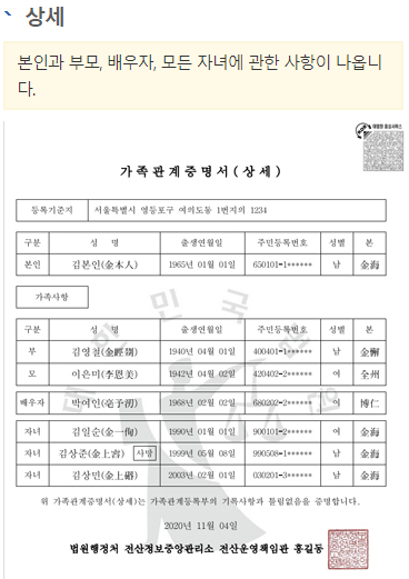 ▶ 상세는 부모님, 본인, 배우자와 모든 자녀들에 관한 사항이 표시됩니다.(사망한 자녀도 표기되며, 본인이 재혼한 경우에는 전배우자와 전 배우자사이의 출생 자녀들까지 함께 기재됨)