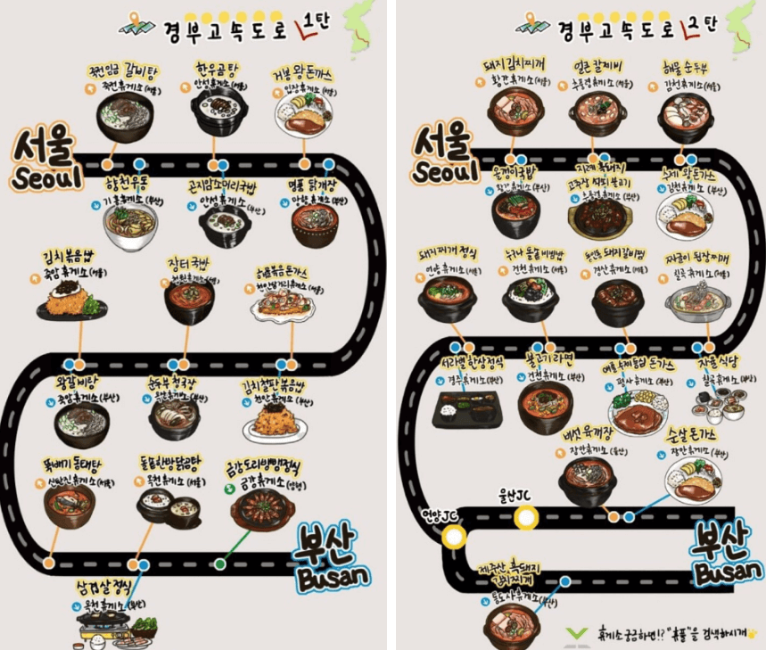 ▶ 경부고속도로의 상행선, 하행선에 위치하고 있는 휴게소들의 맛집입니다. 지루한 운전 시 휴게소에 들르셔서 맛있는 거 드시고 힘내셔서 안전 운전하시기 바랍니다.