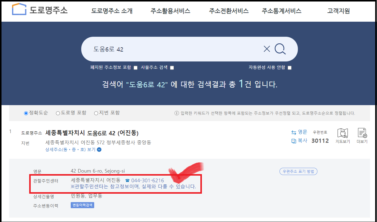 3. 그러면 밑에 관할주민센터가 표시되며 전화번호도 나와 확인이 가능합니다.