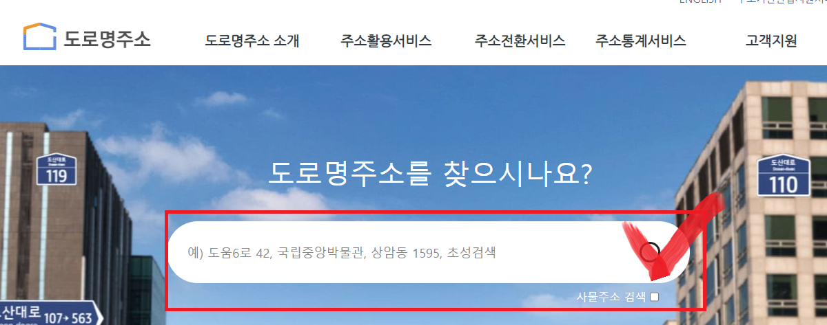 1. 도로명주소 사이트에 접속 후 나의 주소나 찾고자 하는 지역의 아무 주소나 입력 후 찾기를 누릅니다.