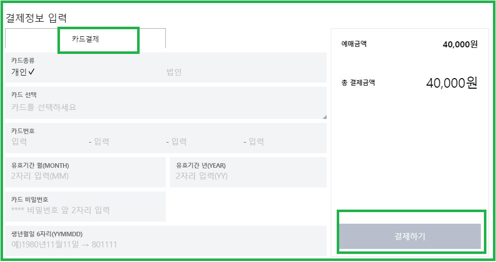 5. "결재정보 입력"후 "결재하기"를 누르면 예매가 완료됩니다.