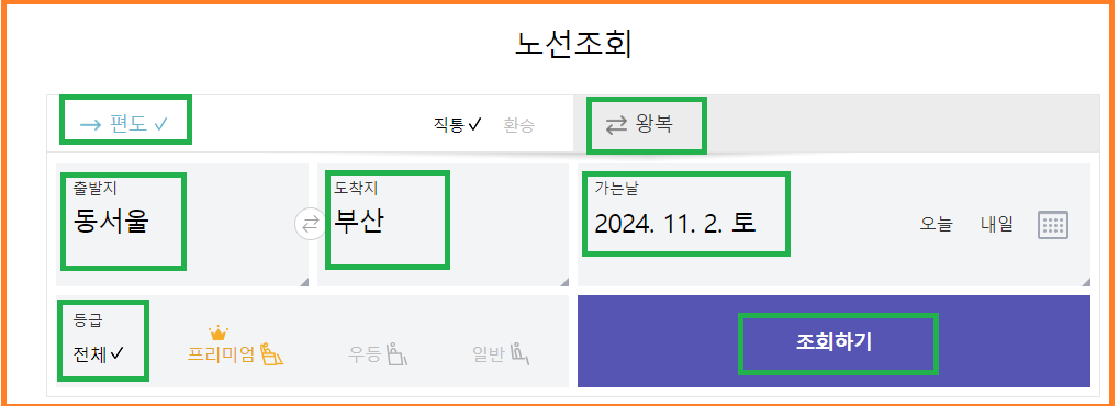 5. 좌석등급을 선택합니다.(전체 / 프리미엄 / 우등 / 일반)