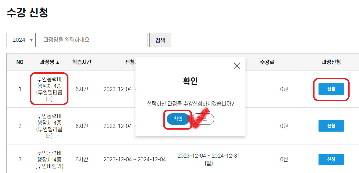 ▶ 3) 2024년의 강의 중에서 '무인동력비행장치 4종(무인멀티콥터)'를 선택합니다.