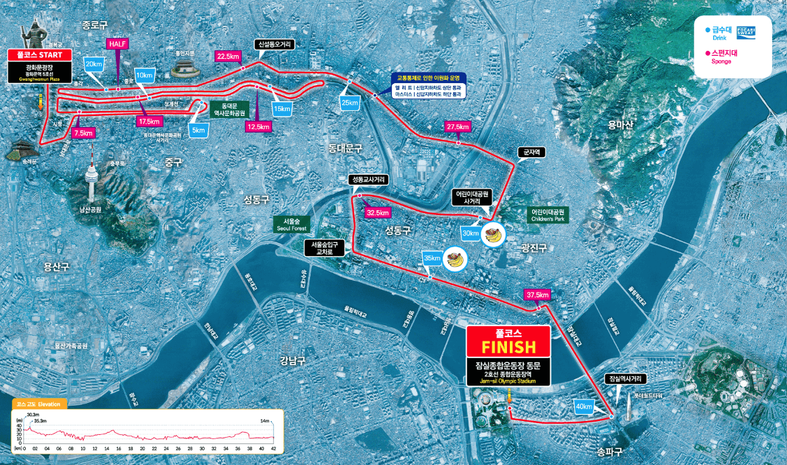 청계천, 을지로, 동대문, 왕십리, 잠실 등 서울의 핵심 지역을 달리는 코스로 평탄한 구간이 많아 기록 경신에 유리한 조건이라서 기록 경신을 목표로 하는 선수들과 참가자들에게는 최적의 코스입니다.