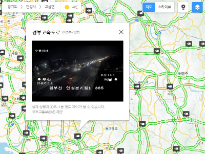 교통상황을 색깔별로 나타내며, CCTV를 누루면 실시간 도로상황을 영상으로 보실 수 있습니다. 네이버 지도에서도 마찬가지로 확인 할 수 있습니다.