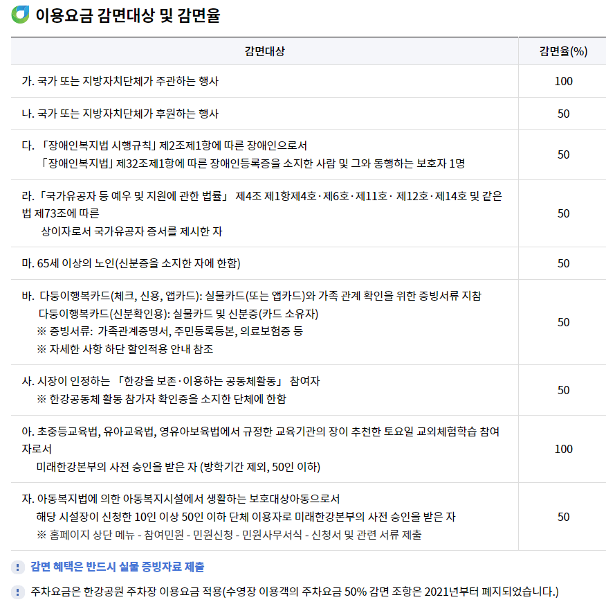 < 이용요금 감면대상 및 감면율 >