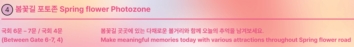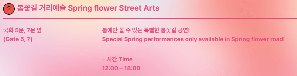 - 국회 5문, 7문 앞에 봄에만 볼 수 있는 특별한 봄꽃길 공연이 12시부터 8시 사이에 마련되어 있습니다.