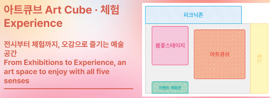 ● 봄꽃 축제장에서는 아트큐브존에서 체험과 전시의 기회를 제공하는데 세부내용을 살펴보겠습니다.