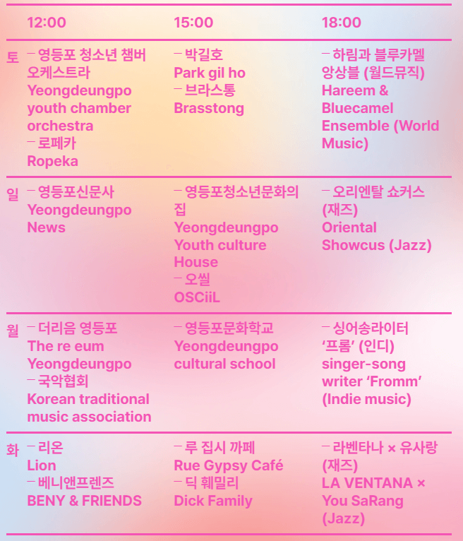 ● 요일별로 12시 / 15시 / 18시 매일 3회에 걸쳐 음악회가 개최됩니다. 하림과 싱어송라이터 '프롬'이 출연하네요.