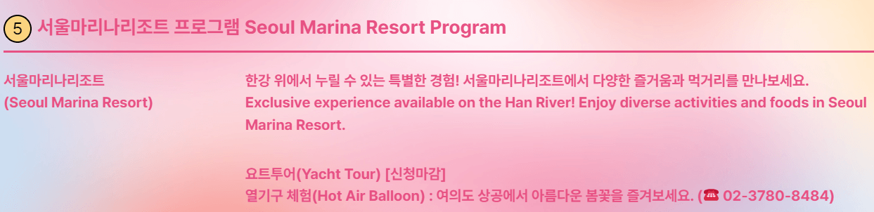 - 서울마리나 리조트에서는 한강 위에서 즐길 수 있는 요트투어, 열기구 체험이 준비되어 있습니다.