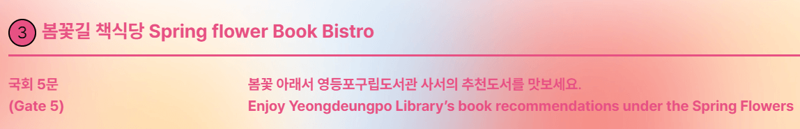 - 국회 5문 앞에서 영등포구립도사관에서 사서분이 나오셔서 봄에 어울리는 추천도서를 보실 수 있습니다.