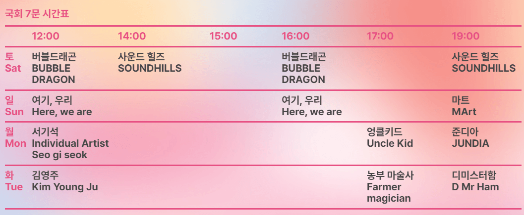 - 국회 7 문 앞 공연 타임테이블은 아래와 같습니다.