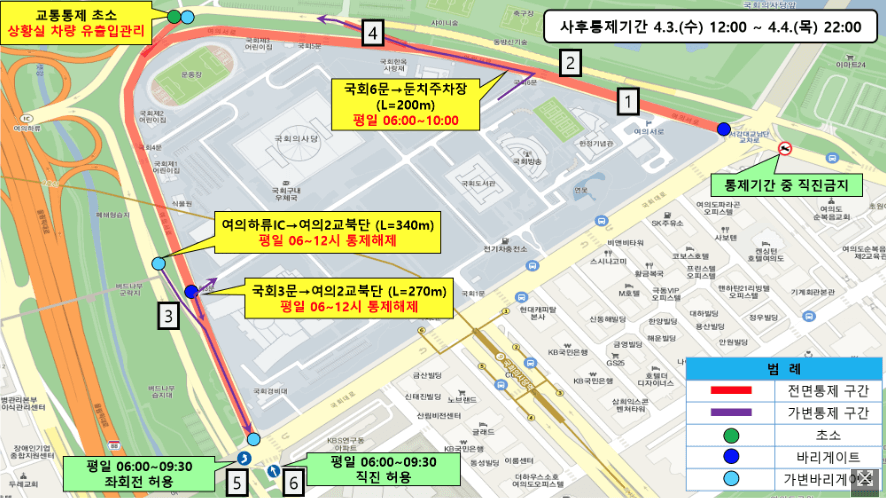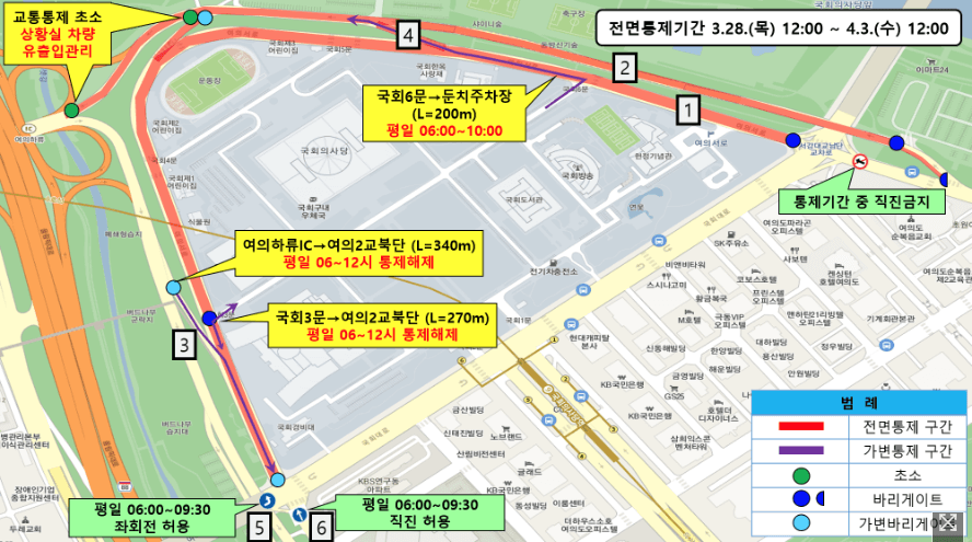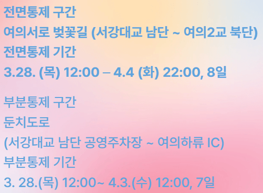 - 전면통제: 여의서로 벚꽃길 (서강대로 남단 ~ 여의 2교 북단)