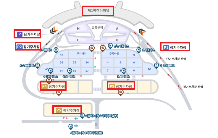 제1여객터미널의 배치도입니다. 장기, 단기, 예약 주차장이 있고 셔틀버스도 운행되고 있습니다. 단기주차장은 터미널 앞쪽에 위치하고 있고 장기주차장은 뒤쪽에 위치하고 있습니다. 가시기 전에 미리 어느 구역에 주차를 할지 정하시고 가시면 당황하지 않고 바로 이용하실 수 있습니다.