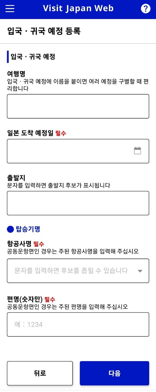 4. 여행정보를 입력합니다.(여행일정, 비행기 편명과 일본 내 연락처는 호텔 주소를 넣습니다.)