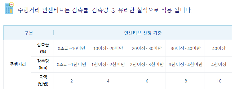 ▶ 인센티브 산정은 주행거리에 따라 다르며 감축률 및 감축량중 가입자에게 유리한 실적으로 적용됩니다.