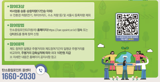 이상 오늘은 탄소중립포인트제(자동차) 가입방법에 대해 알아봤습니다. 선착순 마감이니 기간내 가입하셔서 환경보호를 통해 현금으로 인센티브를 돌려받으시길 바랍니다.