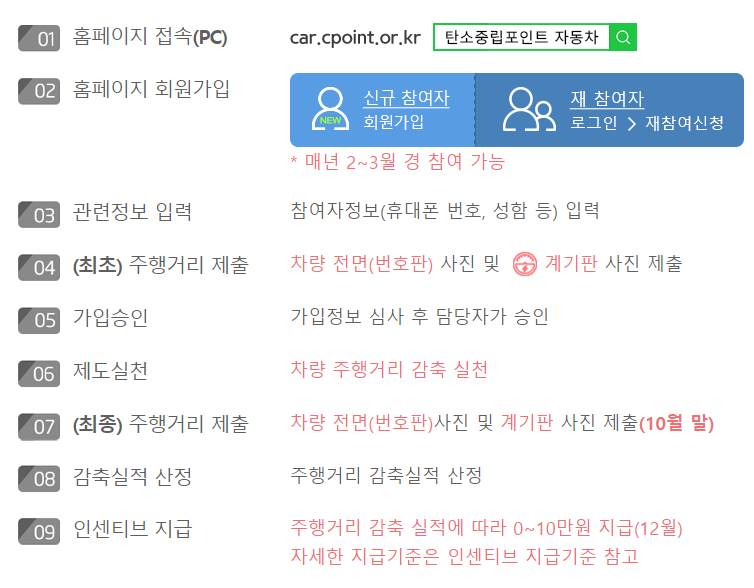 환경부에서 시행하고 있는 자동차 탄소중립포인트제 참여자 모집이 시작되었습니다. 가지고 있는 자동차의 주행거리를 비교해서 년간 최대 10만원까지 현금으로 지급됩니다. 저도 작년에 가입해서 10만원 받았습니다. 어렵지 않으니 자동차 탄소중립포인트제 참여방법울 읽어보시고, 선착순 가입 마감이니 서둘러 가입하셔서 현금혜택 꼭 받으시기 바랍니다.