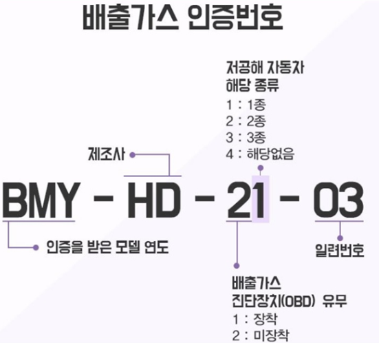 (1) 자동차 앞쪽 보닛을 열면 안쪽에 배출가스 관련 표지판이 부착되어 있습니다. 그 안에 배출가스 인증번호를 확인하시면 됩니다. 끝에서 세 번째 숫자가 1이면 1종, 2이면 2종, 3이면 3종 저공해자동차입니다.