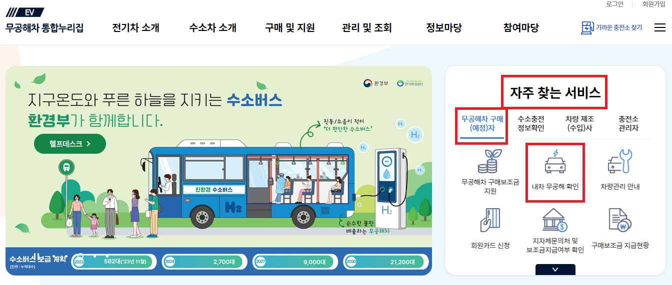 (2) 홈페이지 바탕화면 오른쪽에 '자주 찾는 서비스' - 무공해차 구매(예정) 자 - 내차 무공해 확인으로 들어갑니다.