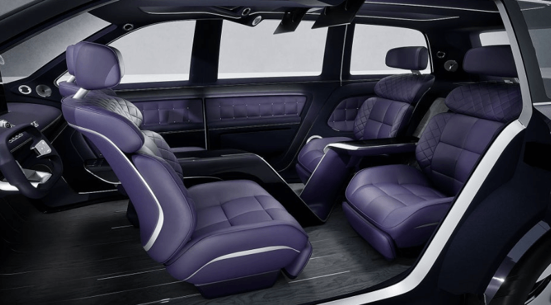 ▶ 실내 색상은 한국 전통색인 '쪽'으로 염색한 퍼플 실트 컬러의 빈티지 가죽을 사용해 깊이 있는 분위기를 연출하였고, 한국 온돌에서 영감을 받아 복사열 난방 시스템, 차량 내부의 대시보드와 도어트림, 바닥과 시트백, 콘솔사이드에 복사난방 필름을 부착해서 저전력 고효율 난방을 가능하게 했습니다.