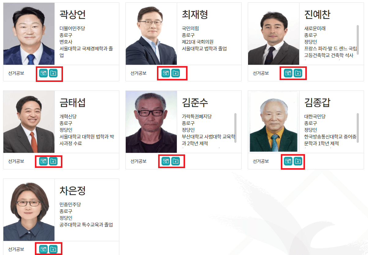▶ 조회를 하시면 출마한 후보자 명단이 나타납니다. 그 후보자 아래에 공약이 첨부되어 있으므로 다운로드 하셔서 살펴보실수 있습니다.