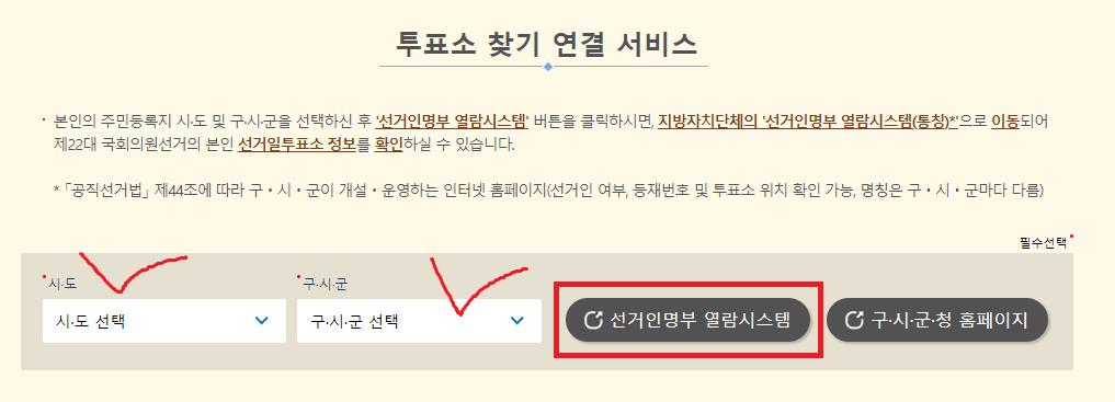 ▶ 먼저 내가 거주하는 시, 도를 선택하시고 다음에 세부 시, 군, 구를 선택 후 '선거인명부 열람시스템'으로 들어가시면 거주지 시, 구, 군청으로 접속이 됩니다.