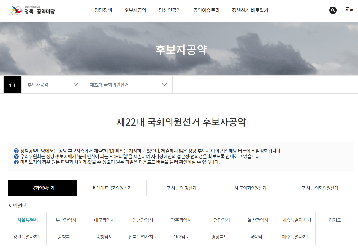 ▶ 후보자별 공약은 정책, 공약마당 홈페이지에서 조회가 가능합니다. 해당 선거를 먼저 선택하시면 됩니다.