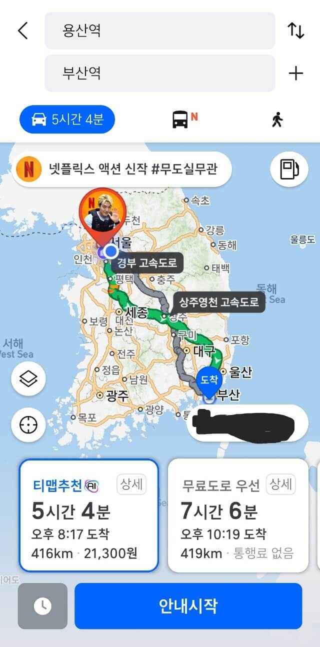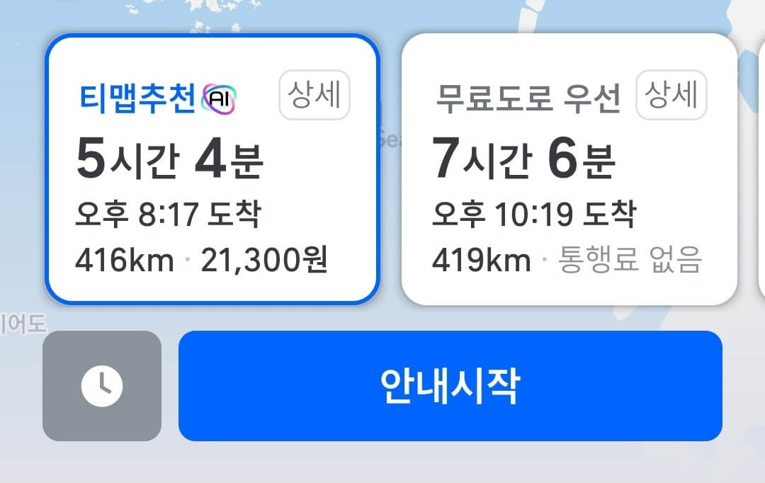 1. 티맵을 켜서 원하는 구간을 입력 후 조회한다.