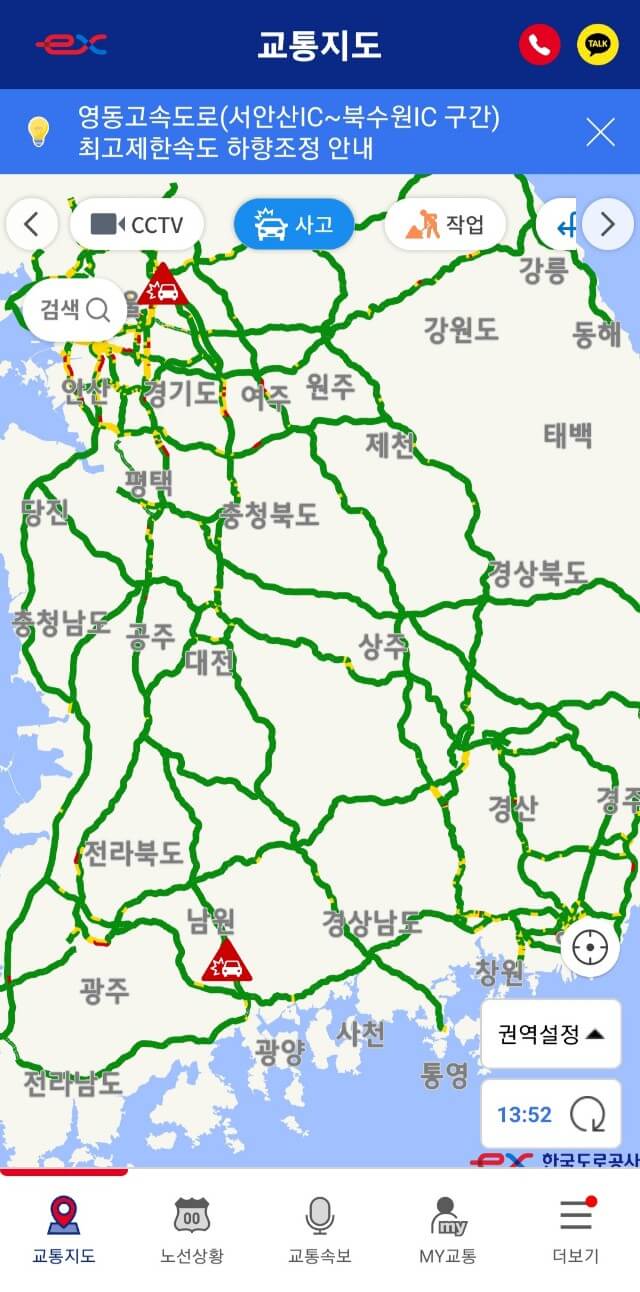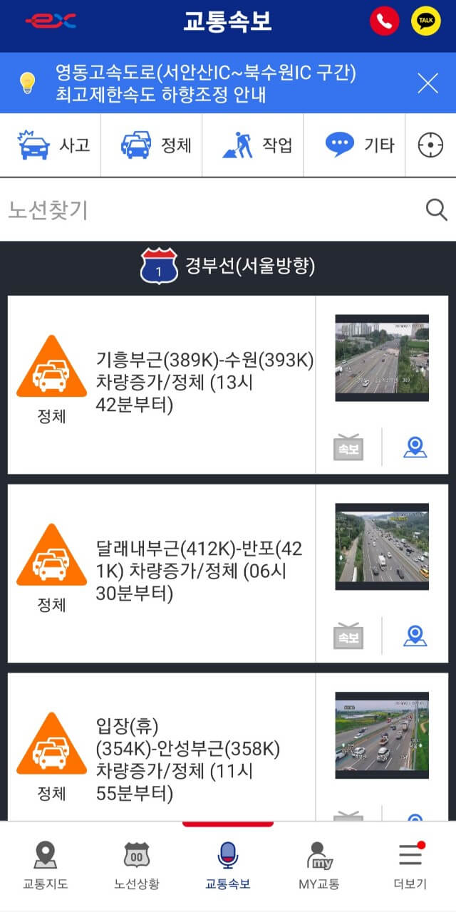 한국도로공사에서 제공하는 '고속도로 교통정보' 어플을 이용하면 각 노선별 실시간 교통상황과, 사고여부, 정체구간까지 한눈에 확인할 수 있습니다.