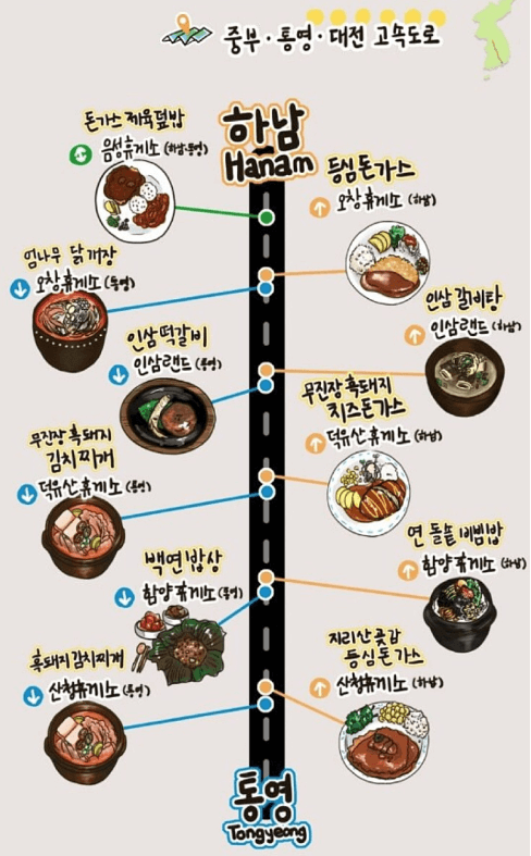 ▶ 한국도로공사에서 선정한 우리나라 전국 고속도로의 휴게소 중에서도 대표적인 맛집과 메뉴를 엄선한 맛지도입니다. 고속도로 운전 시참고하셔서 들러보시기 바랍니다.