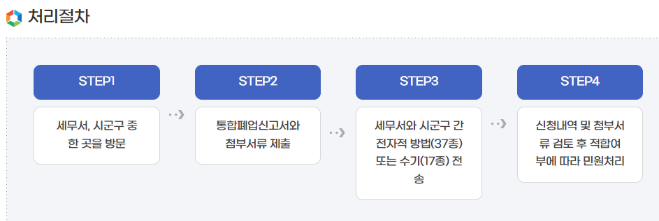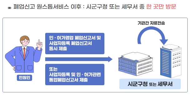 통합폐업신고는 폐업신고 시 시, 군, 구청과 세무서를 각각 방문하던 것을 두 곳 중 한 곳 방문 만으로도 폐업신고를 할 수 있는 제도입니다.
