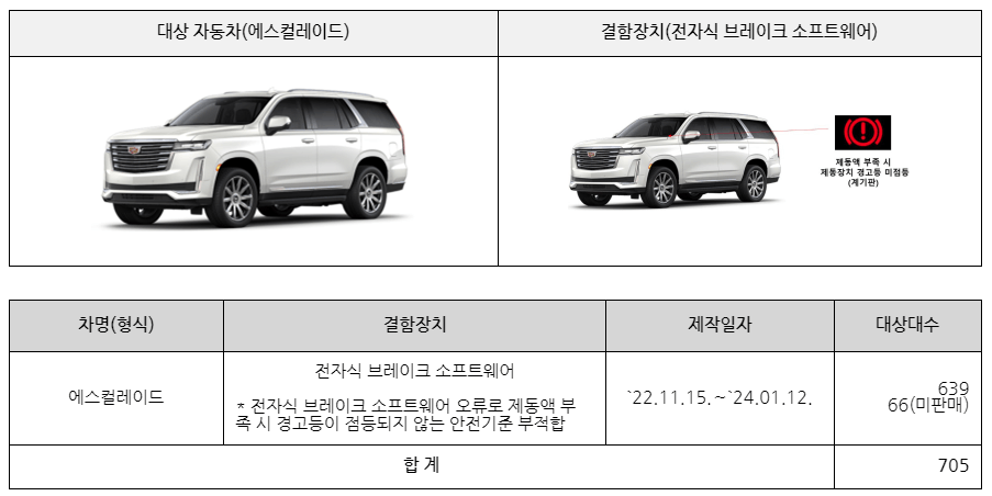 ▶ 지엠아시아퍼시픽과 한국지엠은 에스컬레이드 등 3개 차종 839대는 전자식 브레이크 소프트웨어 오류로 제동액 부족 시 경고등이 점등되지 않는 안전기준 부적합으로 10월 8일부터 시정조치인 리콜에 들어갑니다.