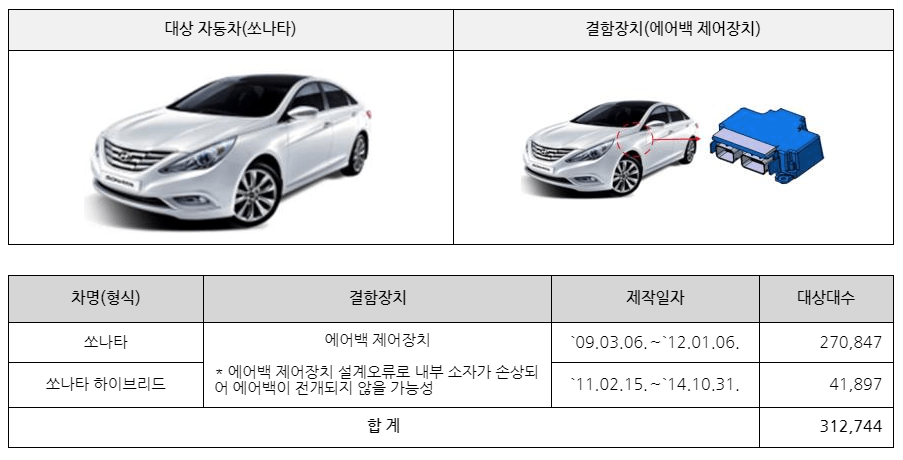 ▶ 현대는 소나타와 소나타하이브리드 2개 차종 312,744대가 에어백 제어장치 설계오류로 내부의 소자가 손상되어 에어백이 전개되지 않을 가능성으로 인해 10월 11일부터 시정조치에 들어갑니다.
