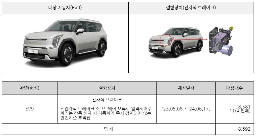 ▶ 또한, EV9은 전자식 브레이크 소프트웨어 오류로 원격제어 주차기능이 정상 작동되지 않는 안전기준 부적합으로 10월 7일부터 8,592대를 시정조치 진행 중에 있습니다.