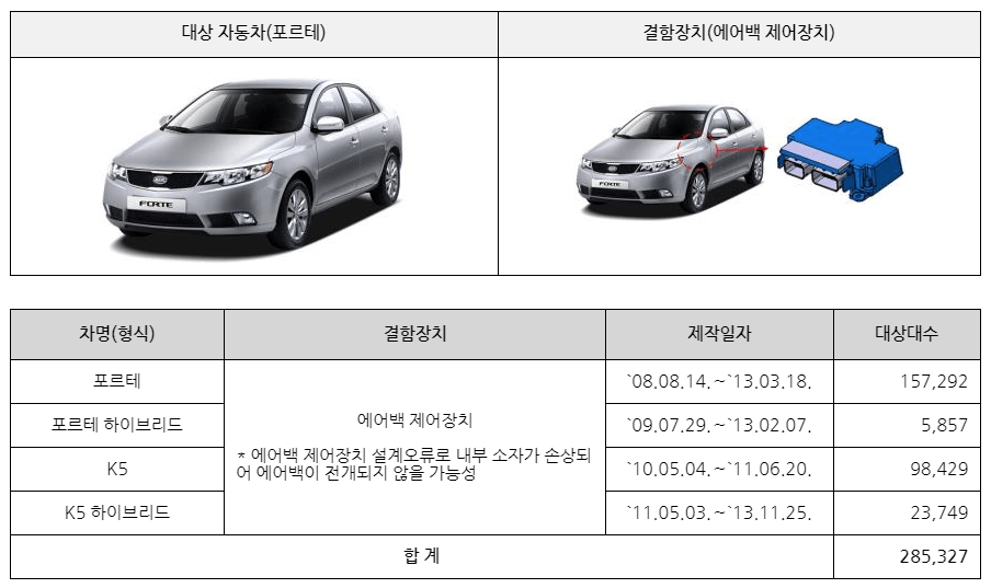 ▶ 기아는 포르테, 포르테하이브리드, K5, K5하이브리드로 4개 차종 285,327대가 대상입니다.