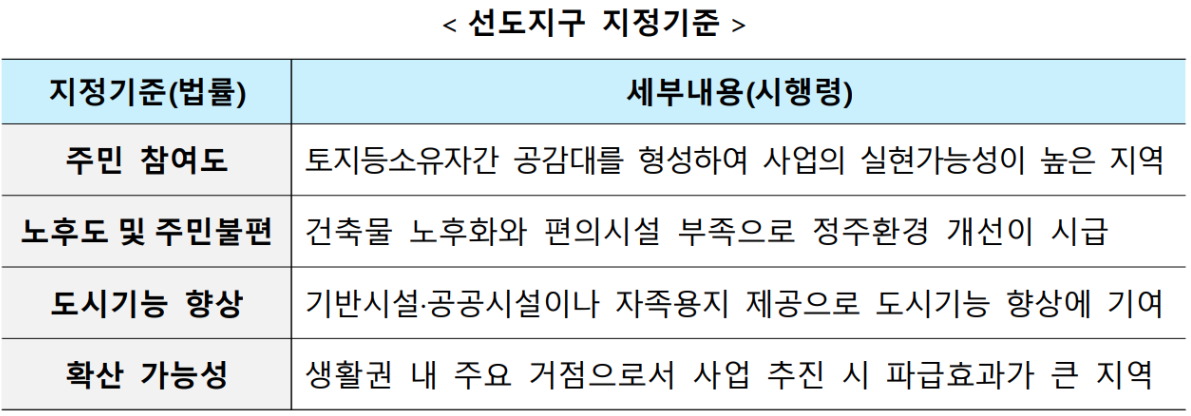 이번에 선도지구에 선정이 안되면 다시 언제 기회가 올지 모르는 만큼 경쟁이 치열하나, 선도지구로 선정이 돼도 주민 간 갈등이 발생되어 사업지 지연되면 선도지구 선정이 취소될 수 있습니다.