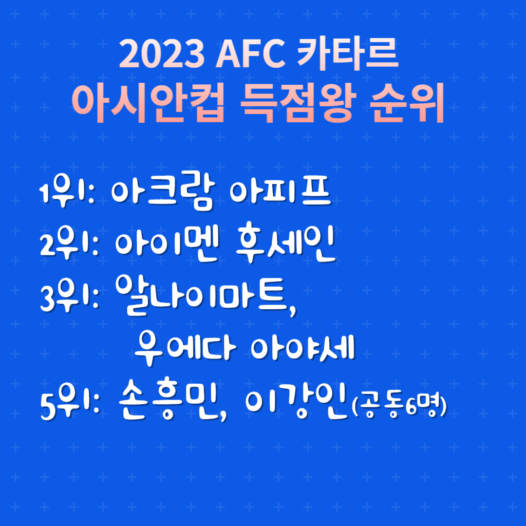 2023 카타르 아시안컵이 종료되고 각종 기록이 발표되었습니다. 그중 아시안컵 선수들의 기록중 득점왕 순위를 알아보겠습니다.
