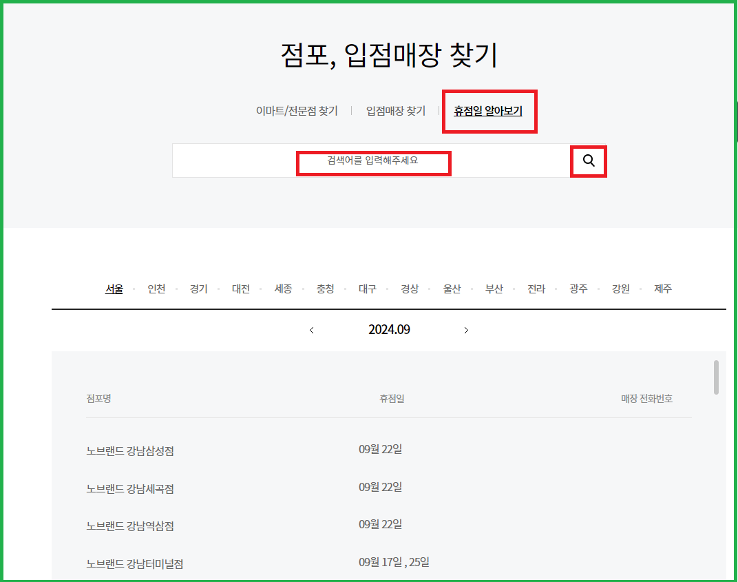 그 아래카테고리 중 제일 끝에 휴점일 알아보기를 누르신 후 알고자 하는 점포명을 입력하시면 됩니다.