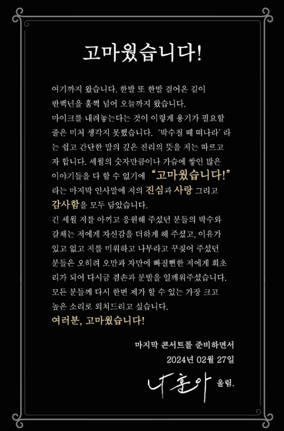 나훈아 님의 콘서트는 '2024 LAST CONCERT 고마웠습니다!'라는 주제로 콘서트가 진행됩니다. 57년이라는 긴 세월 동안 국민가수로 국민들과 함께 하셨는데요. 은퇴하신다니 팬들은 많이 섭섭하실 것 같습니다. 마지막 콘서트 티켓팅에 성공하셔서 대미를 함께하시기 바랍니다.