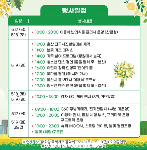 ▶ 이상으로 태화강 국가정원 봄꽃축제에 대해 알아봤습니다. 이번 행사가 끝나도 태화강 국가정원에서는 연중 계속해서 크고 작은 행사가 진행되니 나의 일정에 맞게 방문하여 풍성한 여행이 되길 바랍니다.