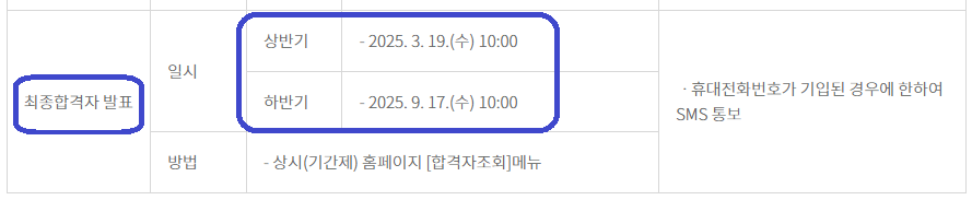 ● 최종합격자 발표는 상반기는 2025. 3. 19일이고, 하반기 발표는 2025. 9. 17일 입니다.