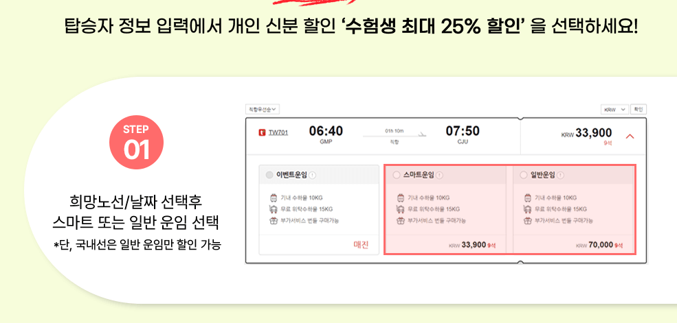 할인 적용은 아래 순서대로 하시고 탑승자 정보입력에서 개인 신분 할인 '수험생 최대 25% 할인'을 선택하면 됩니다.