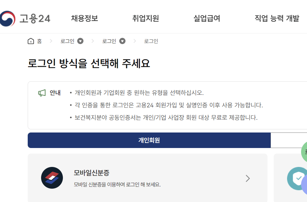 ● 고용24(work24.go.kr) 또는 HRD-Net 접속 → 공동인증서/간편인증 로그인