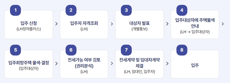▶ 신청하면 LH에서 자격조회 후 대상자를 발표합니다. 그러면 당첨이 되면 희망주택을 물색해서 결정해서 LH에 알려주면 LH에서 해결재 줍니다. 모든 절차가 완료되면 입주하면 됩니다.